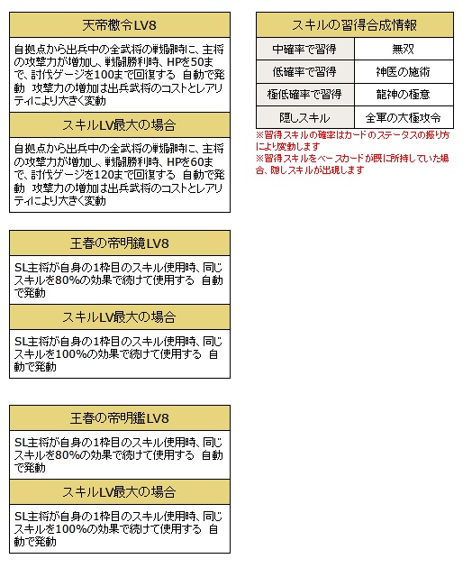 ・変化系スキルを所持している武将カードの1枠目のスキルが発動した際、同じ効果で発動します。