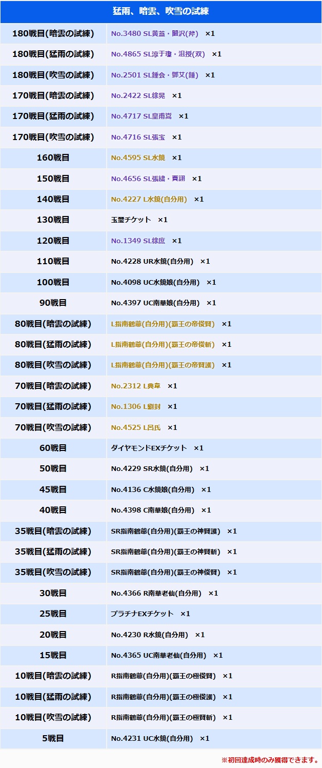 | 猛雨の試練 | 雨に強い兵科のみ挑める試練 | 槍、弓、双兵科 |