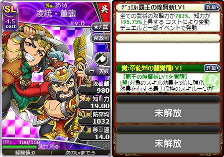 「覇王の煌賢斬LV1」「帝龍韜の闘覚醒LV1」を所持した