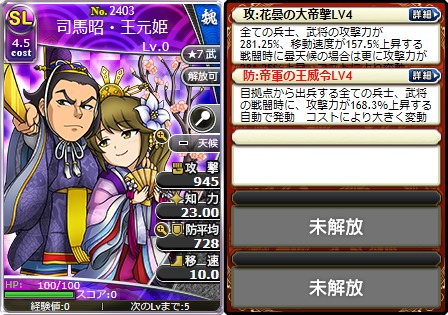 「花曇の大帝撃」「帝軍の王威令」を所持した「No.2403 SL司馬昭・王元姫」、
