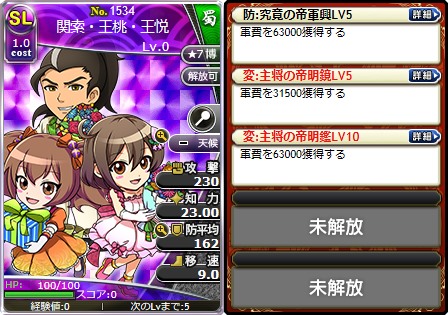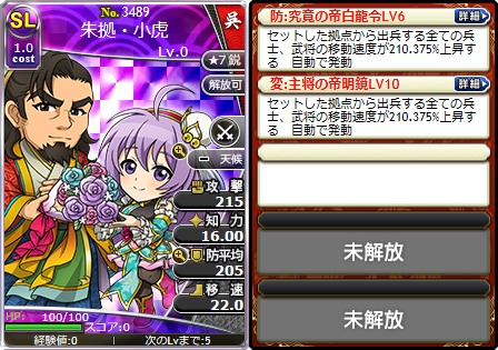 武将カードはLv0、ステータスポイントは割り振りしていない状態で表示されています。