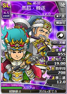 馬騰の息子である馬超と馬超の義兄弟である韓遂。曹操の張魯討伐による出陣を涼州の独立勢力への出陣と疑った韓遂は馬超などの独立勢力の有力者と結託して曹操に反抗した。馬超と韓遂は曹操軍を追い詰めていったが、賈詡の離間の計により仲違いになったところを曹操軍に攻め込まれて敗走することとなった。